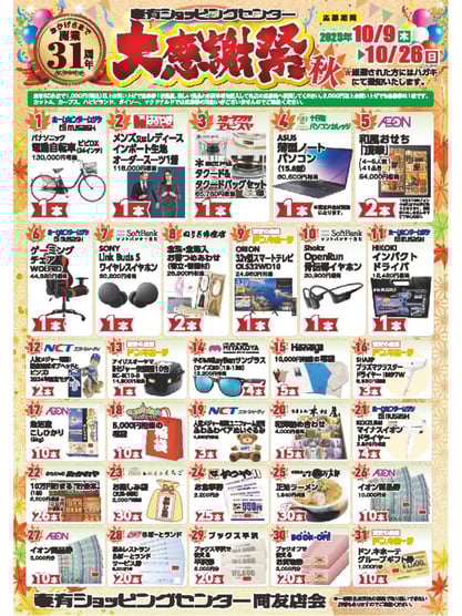 妻有ショッピングセンター 秋の大感謝祭 期間:2025年10月9日(木)~10月26日(日) この度、妻有ショッピングセンタでは、 お客様還元企画の「大感謝祭」を開催します。 期間中に妻有ショッピングセンター内の店舗にて 1,000円以上のお買物をすると貰える 応募券にお好きな賞品番号を記入して応募しよう! 景品総額は約160万円!! 日頃の感謝を込めた、...